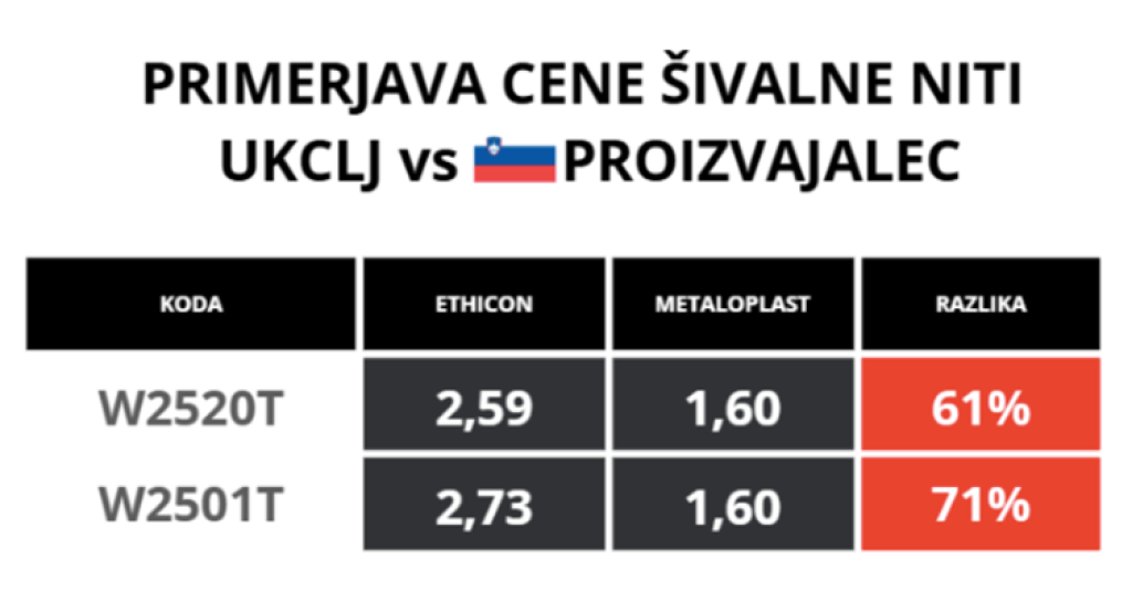 Kot primer se omenja naročilo šivalnih niti v UKC Ljubljana, kjer so bili podpisani dodatni aneksi k pogodbi. Po navedbah kritikov gre za več sto tisoč evrov dodatnih obveznosti, pri čemer sistemske cenovne primerjave niso javno razvidne.