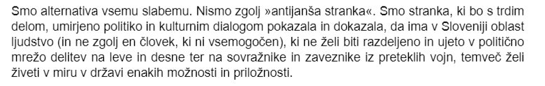 Iz prispevka na MMC: "... Bistveno pri ustanovitvi te stranke je, da se ne osredotoča okrog osrednjega igralca, osebe, temveč okrog PROGRAMA, KI JE v tem delu, kakor je zdaj zapisan, ABSTRAKTEN, ampak vendarle naš ideološki kompas za pripravo volilnega programa," je dejal.
