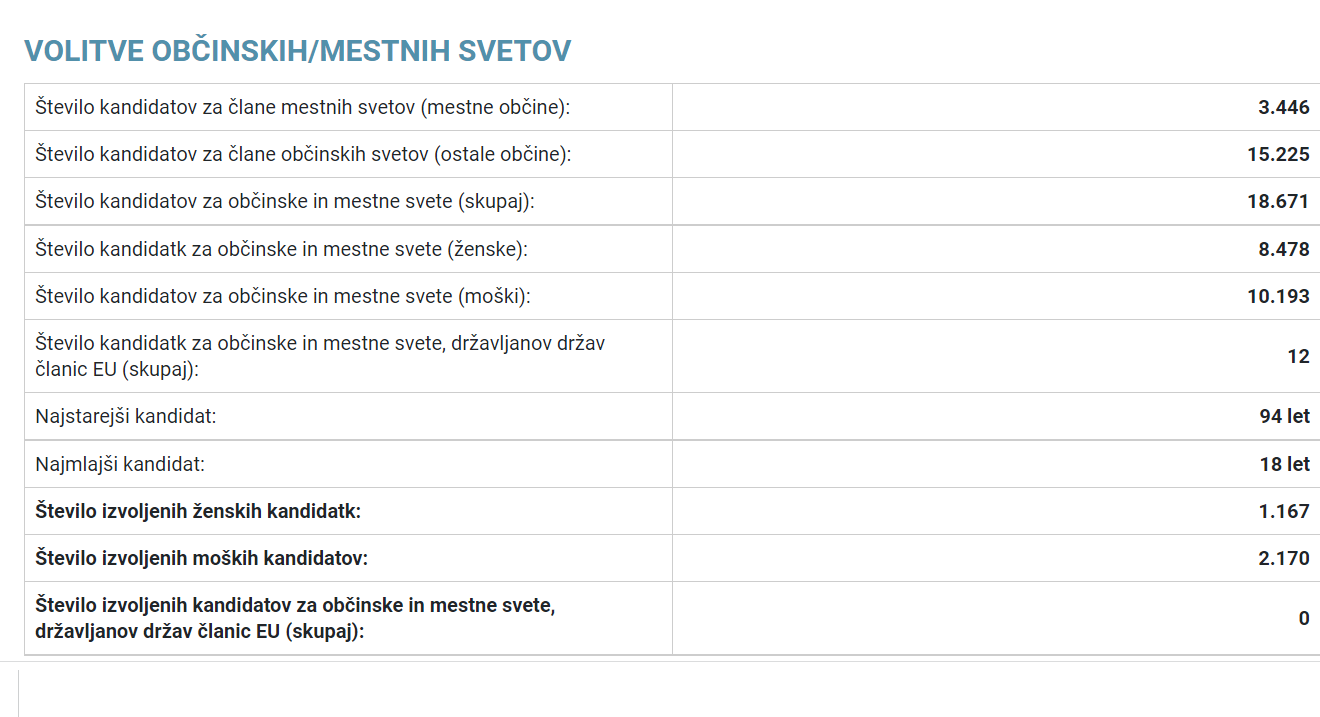 Pri volitvah v občinske in mestne svete je razmerje nekoliko bolj uravnoteženo. Kandidiralo je 8478 kandidatk in 10.193 kandidatov. Izvoljenih žensk je bilo 1168, moških pa 2169. Če smo malo plastični, lahko rečemo, da je torej edini rezultat ženskih kvot v lokalni politiki večje število kandidatk na listah. In to kandidatk, ki jih politika ne zanima, ki nimajo nobenih realnih možnosti za izvolitev in ki so na listi predvsem zato, ker delajo nekomu uslugo, da bodo izpolnjene ženske kvote. Problematike pomanjkanja žensk v politiki se bomo očitno morali lotiti na drug način, ne s predpisi.