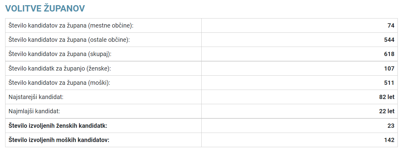 Na letošnjih volitvah se je za župansko mesto potegovalo 107 kandidatk (in 511 kandidatov). V prvem krogu je bilo izvoljenih 23 županj (in 142 županov). V drugi krog pa se je dodatno uvrstilo še 12 kandidatk. Tako da se bo število županj zelo verjetno še povečalo. Na volitvah leta 2018 smo dobili 22 županj.