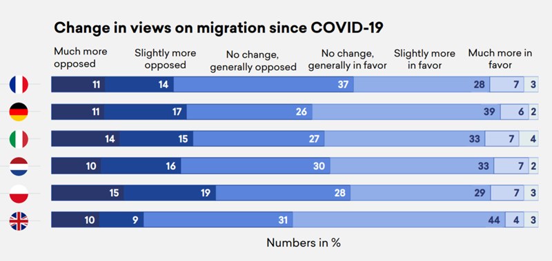 V neki drugi raziskavi, nedavno opravljeni v sedmih državah EU v kontekstu pandemije koronavirusa, migracijam nasprotuje 54 % Nemcev, kar je nekoliko več kot v Veliki Britaniji, približno toliko kot na Nizozemskem in v Italiji in manj kot v Franciji in na Poljskem.