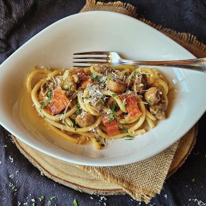 - Kuhane njoke poberemo iz vode s pomočjo penovke in jih takoj dodamo v pripravljeno omako. Razdelimo na krožnike. Preden ponudimo, posujemo s sveže sesekljanim peteršiljem. Zraven ponudimo riban parmezan.