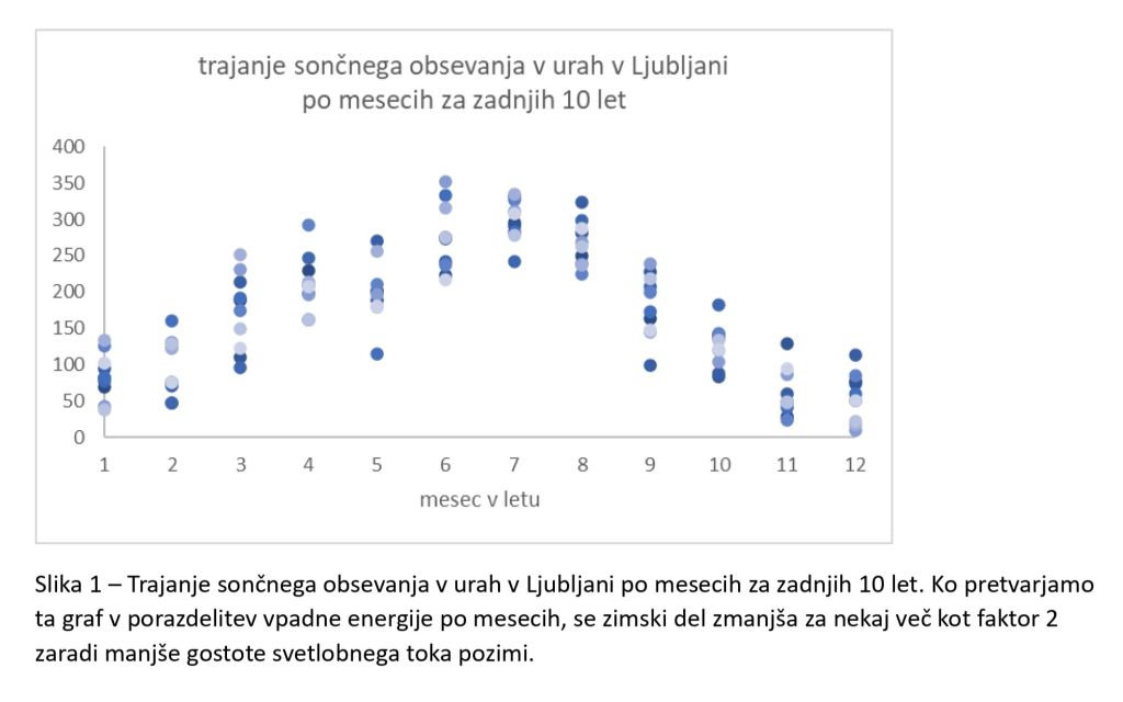 Težava s fotovoltaičnimi paneli pa je v resnici bistveno globlja. Zaradi gibanja Zemlje okoli Sonca in nagiba Zemljine osi ter posledično (nagnjenega dnevnega) vrtenja proti ravnini, v kateri se Zemlja giblje okoli Sonca, se, kot vemo, tako navidezni kot sonca na nebu kot dolžina dneva med letom močno spreminjata – pozimi je tako recimo dan dvakrat krajši. Poleg tega je zaradi meteoroloških vzorcev v zimskih mesecih manj sončnih dni (razen v Alpah, kjer pa ponavadi ne postavljamo sončnih panelov) – Slika 1. Skupaj ta dva vzroka povzročita, da je število t. i. sončnih ur na mesec v zimskih mesecih pet do šestkrat nižje kot v poletnih mesecih. Nadalje, ker je pozimi v naših zemljepisnih širinah Sonce nižje na nebu, sončna svetloba potuje skozi atmosfero skoraj dvakrat dlje kot poleti, kar prispeva k dvakrat večji absorbciji in sipanju preden pade na Zemljino površino. Tam je zaradi tega pozimi vpadla gostota svetlobnega toka dvakrat manjša kot poleti, posledično pa spet nižja vpadla energija. Skupaj s prejšnjima vzrokoma dobimo kar desetkrat manjšo vpadlo energijo na isto površino Zemlje. Na koncu ta faktor še poveča vpliv naklona panelov, ki je velikokrat fiksen in nemalokrat optimiziran na poletne vpadne kote, zaradi česar pri pretvorbi v električno energijo izgubimo še nekaj dodatnih procentov. Vsi učinki skupaj pomenijo, da v zimskih dnevih na isto površino panelov vpade vsaj desetkrat manj sončne energije kot poleti. Zakaj se o tem faktorju nikjer ne govori, ni jasno, izvira pa zgolj in samo iz geometrije vpada sončne svetlobe, gibanja Zemlje in lokalnih meteoroloških značilnosti.