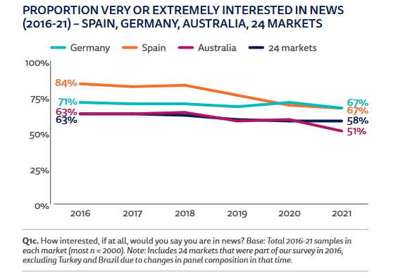Rezultati teh pričakovanj pa nimajo podlage v raziskavi. Ta namreč kaže, da se je interes zanimanja za novice tudi v letu 2021 še naprej zmanjševal. Izjemi sta Nemčija in Nizozemska, kjer je padec majhen ali pa ga skoraj ni zaznati.