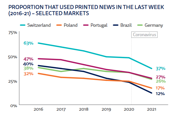 Trg tiskanih medijev drvi proti katastrofi. Vir: Reuters Institute Digital News Report 2021