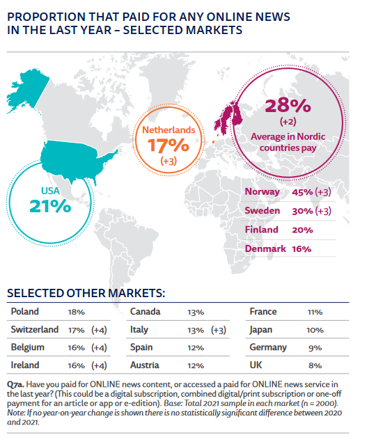 Še pred nekaj leti so sicer strokovnjaki pričakovali, da bo vsaj del bralcev, ki bo nehal brati tiskane medije, presedlal na spletne vsebine. Kot nakazuje raziskava, pa je bil ta optimizem lažen. Število naročnikov na spletne vsebine se je namreč povečalo le za malenkost. Najvišji delež ostaja v skandinavskih državah, kjer v povprečju znaša kar 28 %. Na sosednjem Hrvaškem recimo, pa zgolj 7 %.