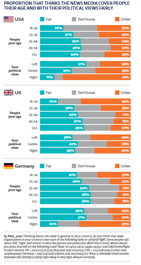 Percepcija zaupanja je sicer močno odvisna od starosti in politične orientiranosti. V Evropi tako na splošno velja, da medijem močno ne zaupajo mladi ter desno politično orientirani državljani. Ta razlika je še bolj občutna v ZDA, kjer kar tri četrtine desno usmerjenih državljanov meni, da medijska pokritost njihovih stališč ni poštena. Medijska obravnava politike v Trumpovem obdobju je prinesla drastičen padec zaupanja v medije kot je denimo CNN.