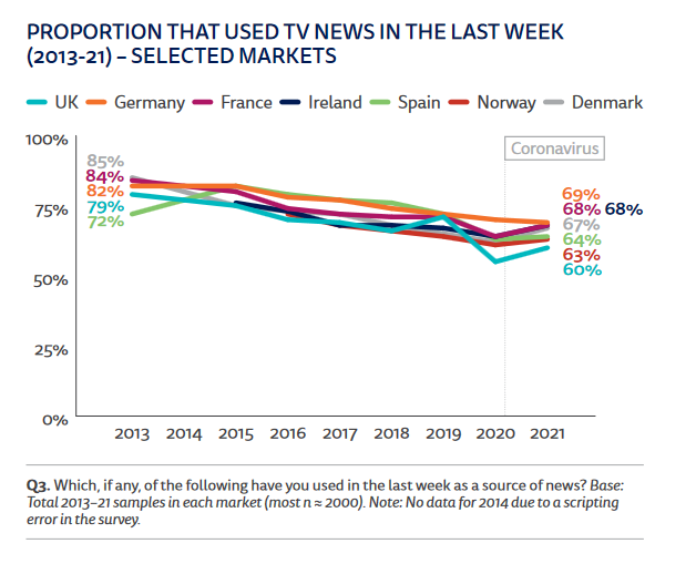 Ena redkih zmagovalk koronavirusne krize je televizija. Tudi ta dolgoročno gledano sicer izgublja svoj vpliv, vendar pa so se trendi upadanja spremljanja novic na televiziji v zadnjem letu občutno ustavili.