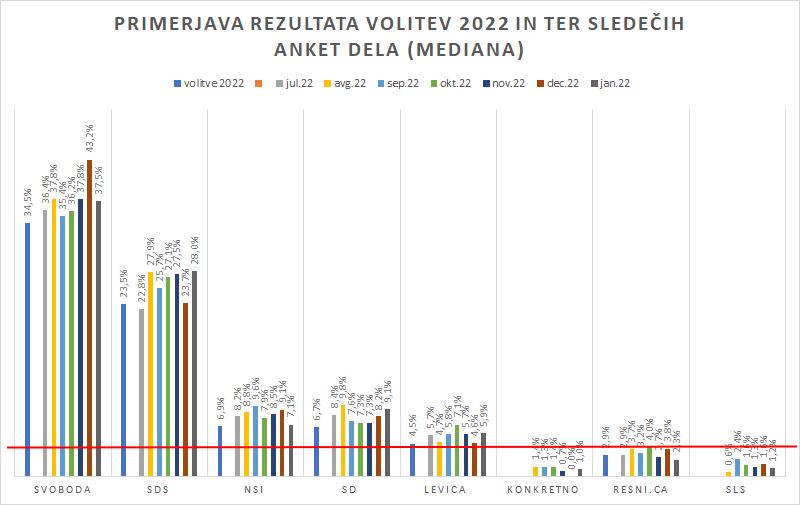 Če bi bile volitve minulo nedeljo, bi po anketi Mediane za Delo Gibanje Svoboda volilo 29,1 % vprašanih, oziroma pet odstotnih točk manj kot mesec poprej. SDS bi dobila 21,7 %, oziroma tri odstotne točke več kot decembra, v pozitivnem trendu pa je tudi SD s 7,1 % podporo. Po dobrih prejšnjih dveh mesecih je NSi tokrat padla za 1,7 odstotne točke na 5,5-odstotno podporo med vsemi anketiranci. Levica je odstotno točko pridobila s 4,6 %.
