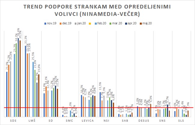 Če bi bile volitve minulo nedeljo, bi po rezultatih Ninamedie SDS obkrožilo 22,1 % vprašani, LMŠ 12,2 %, SD 8,2 %, Levico 6,1 %, NSi 4,1 %, DeSUs 3,7 %, SNS in SLS 1,8 %, SAB 1,1 % in SMC 0,3 % vprašanih. 28 odstotkov je neopredeljenih, desetina ne bi volila nobene stranke.
