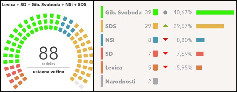 Če bi bile volitve minulo nedeljo, bi Gibanje Svoboda podprlo 38 % opredeljenih anketirancev, SDS 28,5 % in NSi 6,7 %. Sledita Levica s 6,5 % in SD s 6,1 % podporo med opredeljenimi sodelujočimi v anketi Mediane. Zelo blizu parlamentarnega praga bi s 3,7 % bila še Stevanovićeva Resni.ca, medtem ko druge stranke niso blizu parlamentarnega praga. Neopredeljenih je bilo v anketi 12 %.