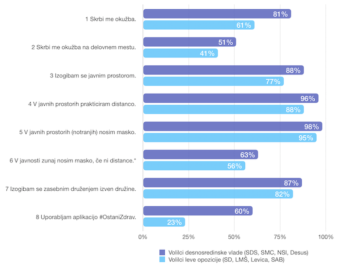 - Zaščitne ukrepe upošteva nekaj več volivcev koalicije, a je na tem področju razlika manjša (večinoma manj kot 10 odstotnih točk). Najbliže sta si obe skupini pri nošnji mask v zaprtih javnih prostorih - maske redno nosi več kot 95 % obeh skupin volivcev.