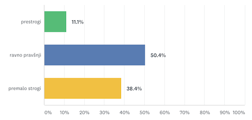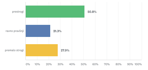 Zanimiv pa je rezultat pri tem vprašanju med volivci leve opozicije. Le polovici volivcev leve opozicije se zdijo ukrepi prestrogi, medtem ko ostali polovici pravšnji ali celo premalo strogi.