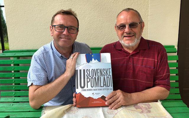 Anton Tomažič z Martinom Liscem, direktorjem celovške Mohorjeve, pri kateri je izšla knjiga V objemu slovenske pomladi.