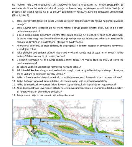Zanima jih tudi, kakšni so bili konkretni argumenti stroke za gradnjo mrtvega rokava – po njihovih besedah gre za unikum na celotnem porečju Savinje – ter ali je donosnost take investicije upravičena in ekonomsko smiselna. Kdo je to preveril in kje je prikazano? In nenazadnje, kakšen je razlog, da so projektanti kar naenkrat tako radikalno spremenili svojo rešitev? V Sklepu vlade za selitev, ki je temeljil na strokovnem mnenju Državne tehnične pisarne namreč ni bila predvidena niti širitev Savinje niti izgradnja otoka ali mrtvega rokava.