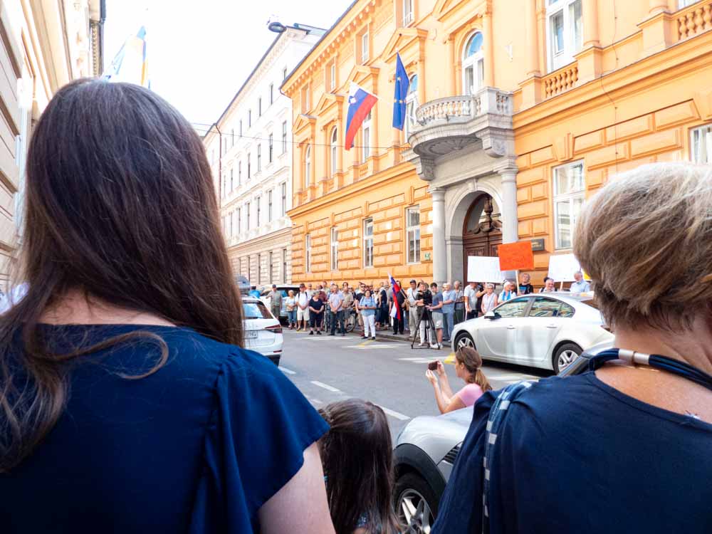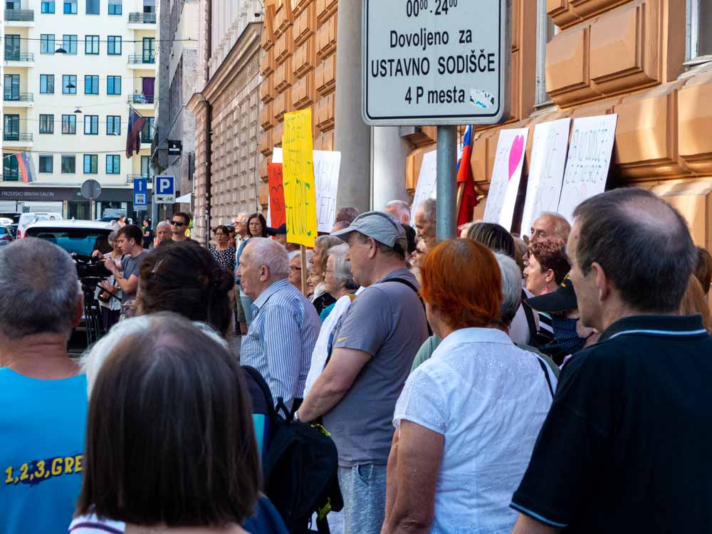 A predstavnikov zmagovalcev referenduma, ki so želeli prisostvovati v postopku, zraven niso povabili, zato jih je nekaj sto zasedlo pločnik pred Ustavnim sodiščem na prvem shodu, ki je bil delno uperjen tudi proti vladi Roberta Goloba.
