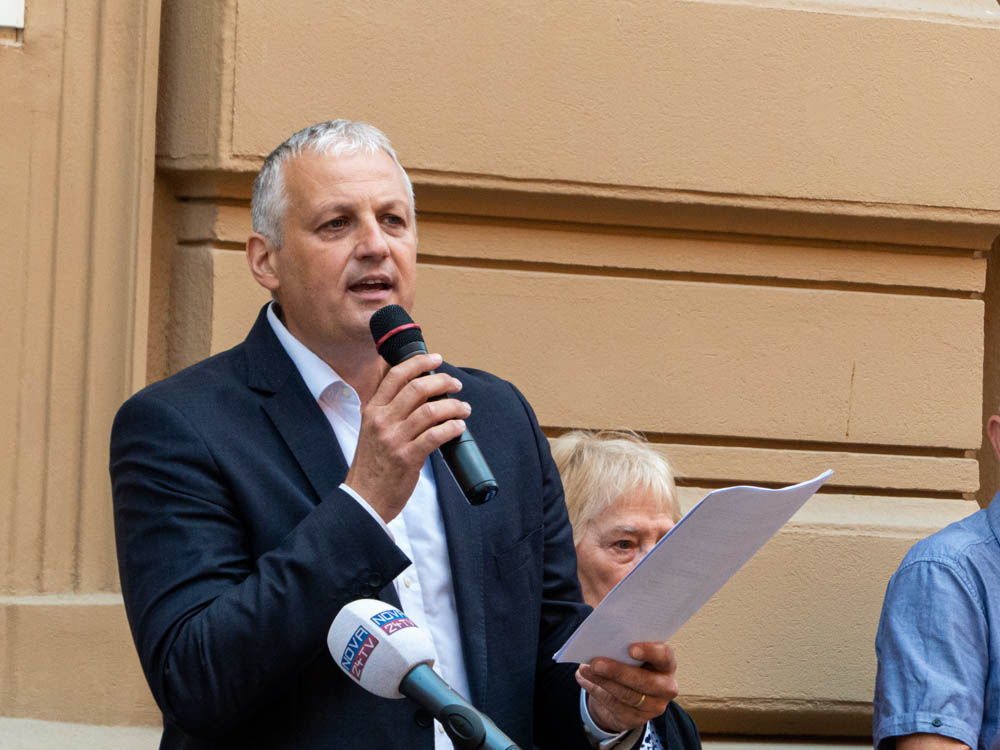 »Danes o teh vprašanjih odloča 9 ustavnih sodnikov, pri čemer že večina petih zadošča, da sprejme odločitev. A 5 sodnikov ne more odločati o tem, kar je že odločilo ljudstvo. Ker nas niso povabili niti na razpravo, razglašam ta pločnik pred ustavnim sodiščem za razpravno dvorano,« je zbrane nagovoril Primc.
