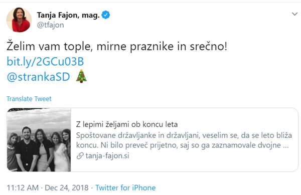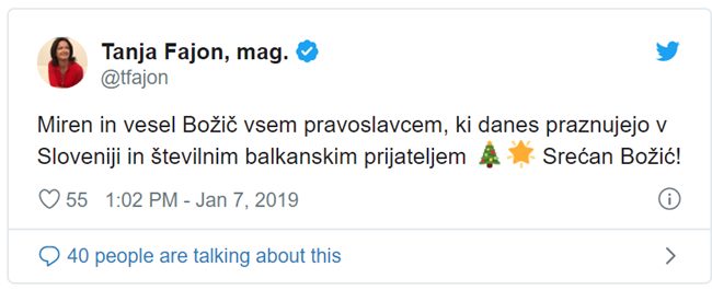 Poplave bednih, dolgočasnih in politično korektnih božičnih, pardon prazničnih voščil se mi ne zdi vredno komentirati. Kar mi daje misliti, pa je voščilo, ki ga za božič svojim sledilcem na Twitterju namenja SD-jeva Tanja Fajon. Ko gre za božič, običajno vošči za brezvsebinske praznike, za pravoslavni božič pa vselej vošči za božič, enkrat imam v spominu, da je celo omenjala Jezusovo rojstvo.