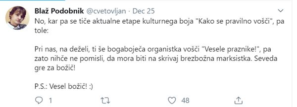 Glede na dejstvo, da levi spekter slovenske politike vsebino še vedno črpa iz časov, ko je bil božič delovni dan, učitelji pa so naslednji dan pregledovali, če je kateri izmed učencev nenavadno zaspan, kar bi lahko pomenilo, Bog ne daj, udeležbo na polnočnici, je zadrega okoli božičnih voščil po svoje razumljiva.