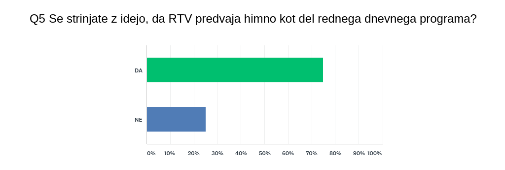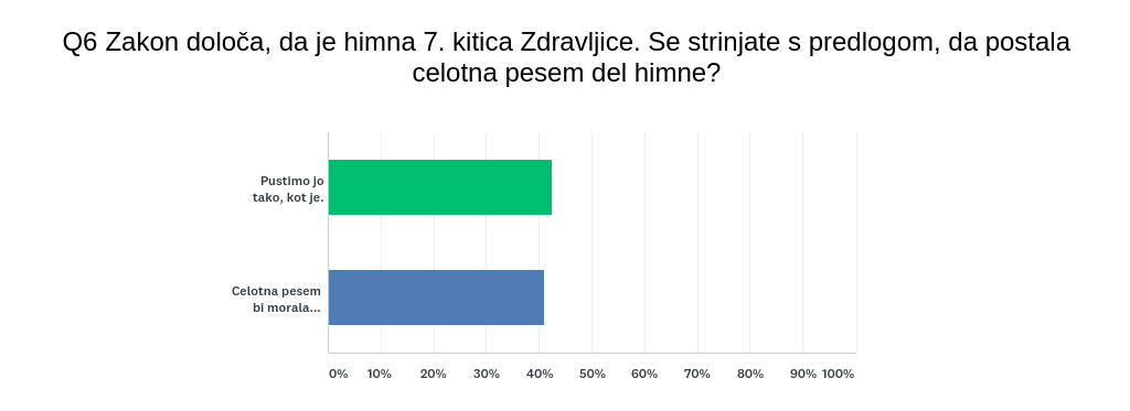 V anketi smo vas spraševali glede vašega mnenja o Zdravljici kot slovenski himni, primernih priložnostih za izvajanja in morebitnih spremembah, ki bi jih želeli uvesti pri slovenskih himni.