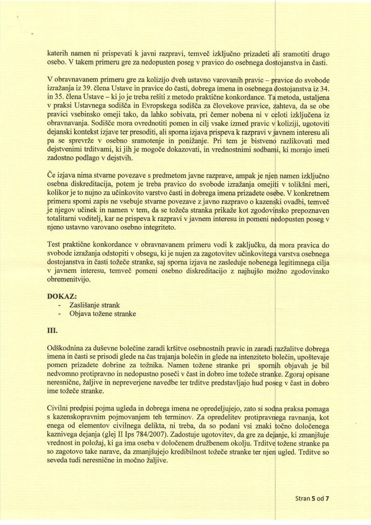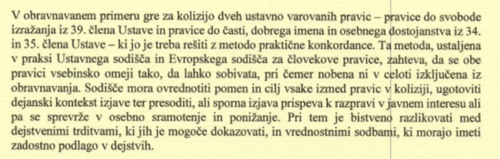 Tožniki poudarjajo še, da gre v obravnavanem primeru za »kolizijo« pravice do svobode izražanja in pravice do časti, dobrega imena in osebnega dostojanstva. Pri tem mora sodišče ovrednotiti pomen in cilj vsake izmed teh pravic oziroma presoditi, ali sporna izjava prispeva k razpravi v javnem interesu ali pa se sprevrže v osebno sramotenje.