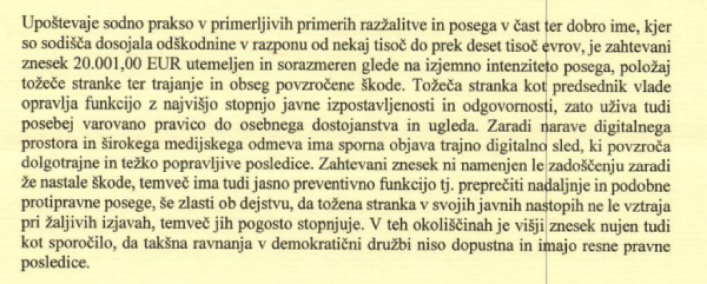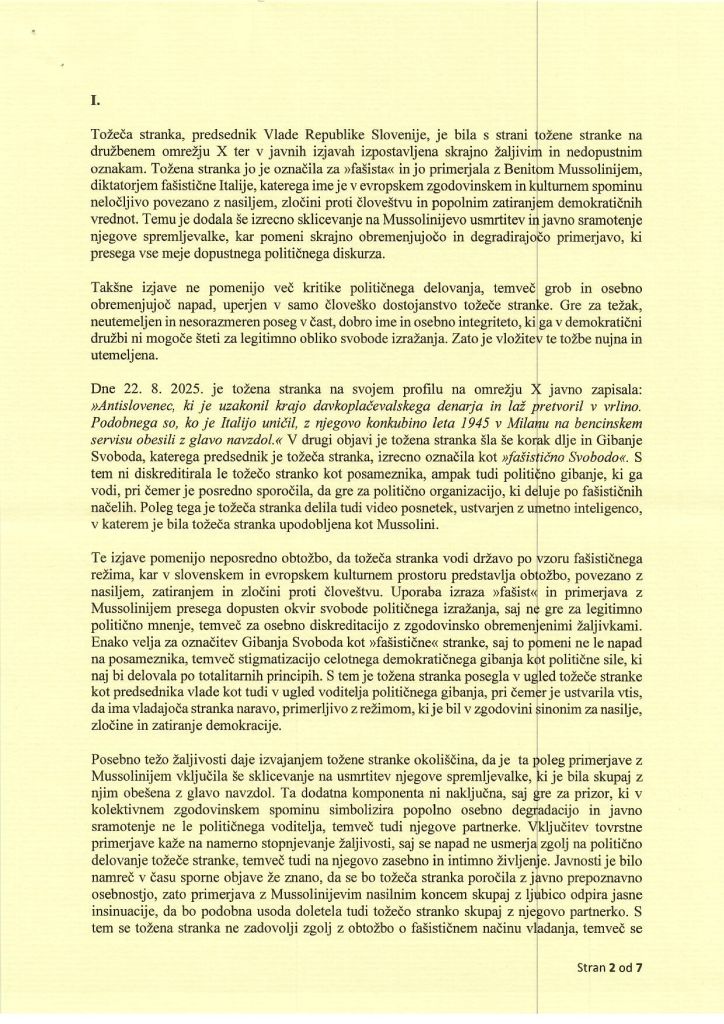 Kot je med drugim navedeno v tožbi, je bil predsednik vlade na družbenem omrežju X izpostavljen »skrajno žaljivim in nedopustnim oznakam«. Štrancar ga je namreč označil za fašista in ga primerjal z Benitom Mussolinijem, to ime pa da je v evropskem zgodovinskem in kulturnem spominu neločljivo povezano z nasiljem, zločini proti človeštvu in popolnim zatiranjem demokratičnih vrednot.