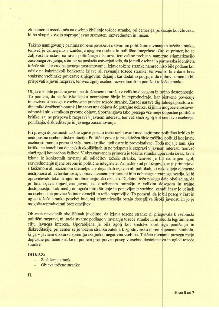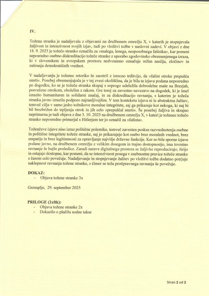 Drugi dokument, v katerem tožnik poziva tožečo stranko k odgovoru na tožbo, je Okrožno sodišče v Novi Gorici prejelo 10. 10. 2025. Tu objavljamo drugo stran pripravljalne vloge, v katerem tožnik utemeljuje tožbo z nadaljevanjem toženčevega pisanja.