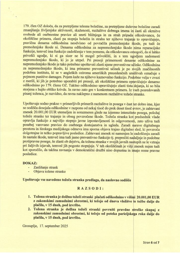 Sicer pa je tožbo označil za »pravo skrpucalo«. Med drugim opominja, da je kot tožeča stranka naveden Robert Golob osebno, takoj na naslednji strani pa, da je tožeča stranka predsednik vlade. »Naloga za medije, kdo bo to farso plačeval, Golob osebno ali davkoplačevalci?!« je pripisal.