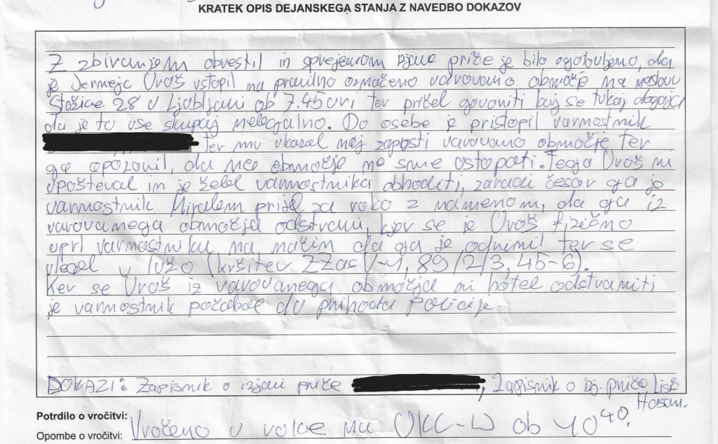 Policija je Urošu Jernejcu izdala plačilni nalog v višini 400 evrov, saj je bil obtožen napada. Zapisnik, ki ga objavljamo spodaj in o katerem smo že pisali, je bizaren; ne zgolj zaradi vsebine, ampak tudi, ker temelji na izjavah varnostnikov - napadalcev.