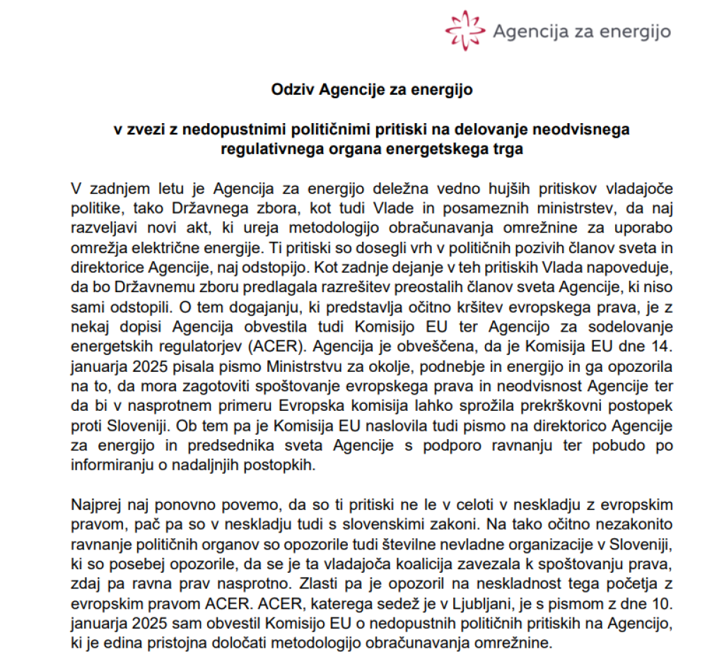 Kot smo že poročali, je Agencija za energijo Evropsko komisijo obvestila o dogajanju na področju uvedbe novega sistema obračunavanja omrežnine v Sloveniji, komisiji so opisali tudi poskuse poseganja v neodvisnost regulatorja. Spomnimo, vlada je decembra svet Agencije za energijo zaradi dogajanja glede nove metodologije za obračun omrežnine pozvala k odstopu, kmalu za tem sta odstopila dva člana. »Vlada bo vsekakor državnemu zboru predlagala razrešitev svetnikov, ki niso samostojno odstopili,« pa je pred kratkim dejal minister za okolje, podnebje in energijo Bojan Kumer in dodal, da ima po njegovem mnenju vlada pristojnost, da pozove k spremembi metodologije in k odstopu članov sveta agencije. Ministrstvo ob tem tudi razmišlja o uvedbi interventnega zakona, s katerim bi omilili najbolj »ekscesne« primere dvigov omrežnin.