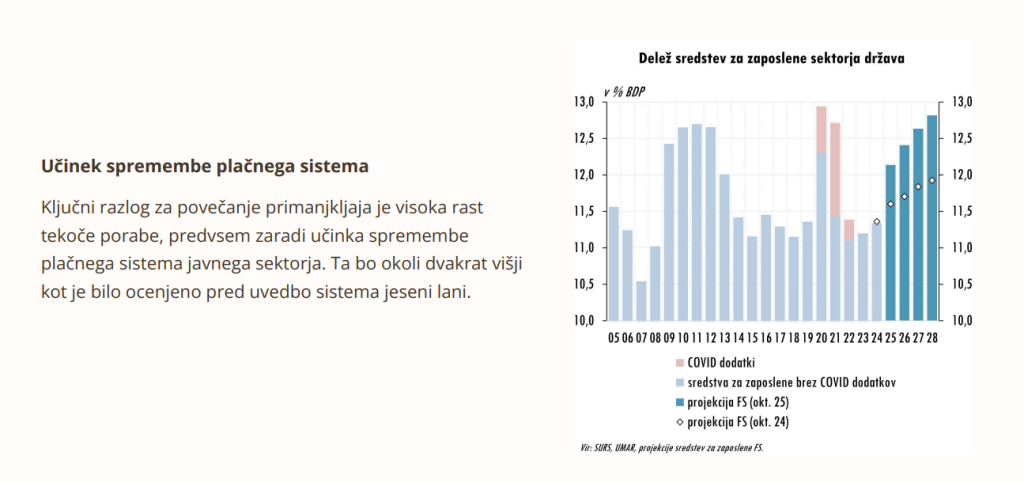V Fiskalnem svetu RS so namreč izračunali, da bi se primanjkljaj sektorja država do leta 2028 povečal na približno 2,5 odstotka BDP, predvsem zaradi rasti tekoče porabe, povezane s spremembo plačnega sistema v javnem sektorju.