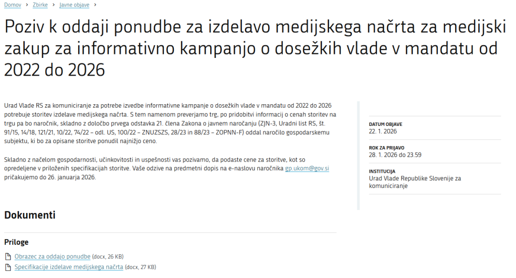 Urad vlade za komuniciranje je v četrtek objavil »Poziv k oddaji ponudbe za izdelavo medijskega načrta za medijski zakup za informativno kampanjo o dosežkih vlade v mandatu od 2022 do 2026«. Z drugimi besedami – vlada poziva medije, naj ji pomagajo pri volilni kampanji, in to za davkoplačevalski denar.