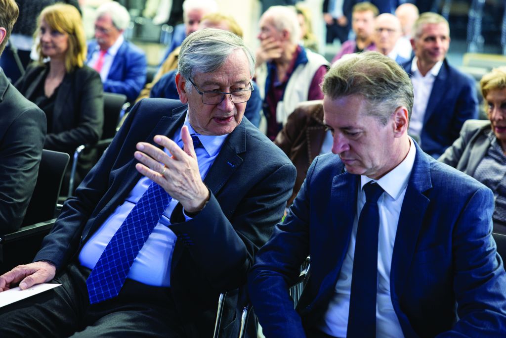 Nekdanji predsednik Danilo Türk in predsednik vlade Robert Golob se nahajata na uradnem dogodku, kar domnevamo iz oblačil.
