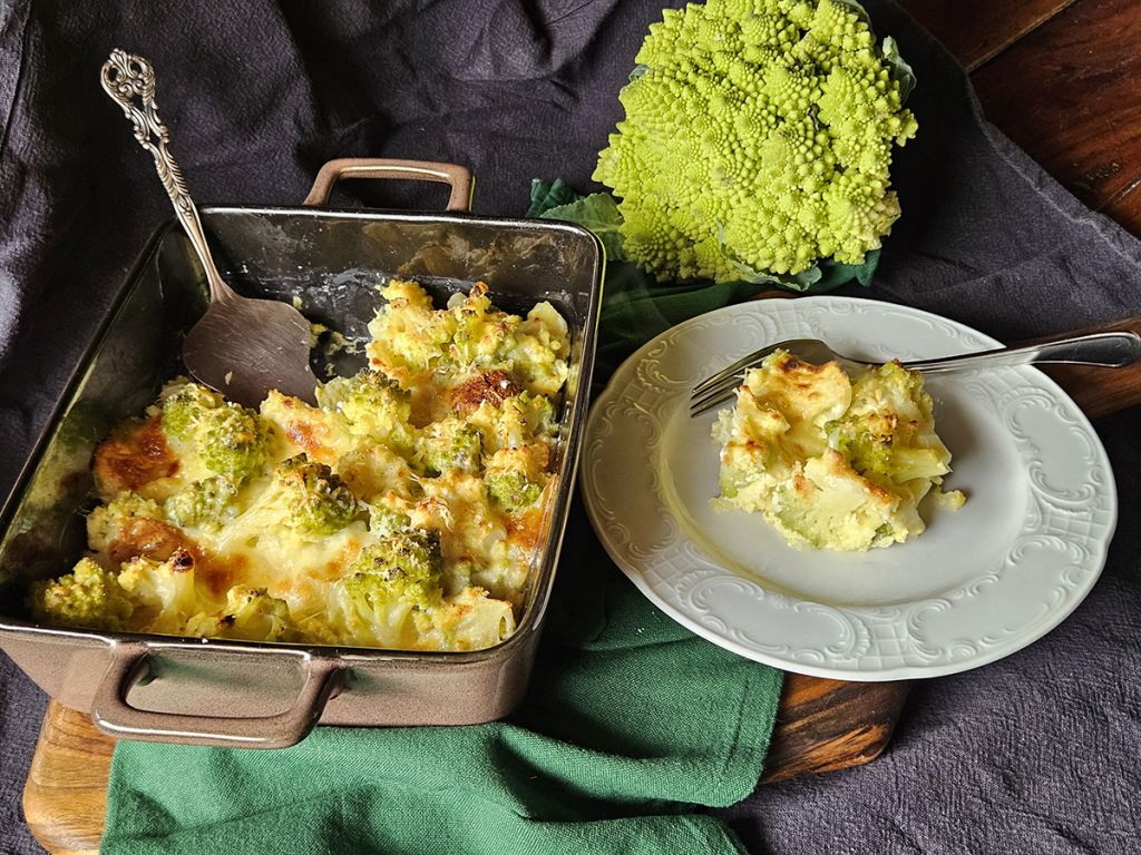 - Ohlajen brokoli razporedimo po manjšem keramičnem pekaču in ga prelijemo z mešanico iz kisle smetane in jajca.