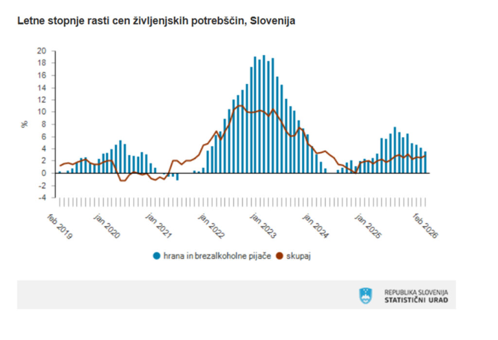 Slovenija je februarja 2026 zabeležila 2,8-odstotno letno inflacijo, merjeno z vseevropsko primerljivim harmoniziranim harmoniziranim indeksom cen življenjskih potrebščin (HICP). Pred letom dni je bila inflacija 1,9-odstotna, kar pomeni, da se je rast cen v Sloveniji v zadnjem letu okrepila. Tudi po nacionalnem indeksu cen življenjskih potrebščin (ICPŽ) je bila inflacija visoka 2,9-odstotna. Podatki tako kažejo, da inflacija pri nas ponovno raste.