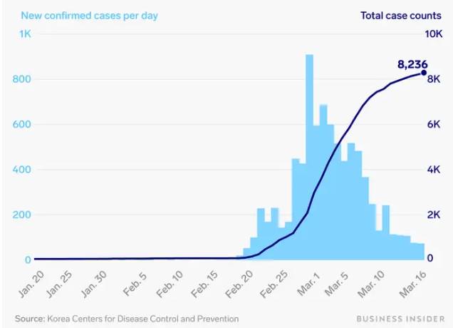 Zanimiva je tudi primerjava Južne Koreje in ZDA, ki sta obe svoj prvi primer koronavirusa zabeležili 20 januarja. Do torka je Južna Koreja dosegla 8.320 okuženih, ZDA pa 6.420. Zanimivo pa je, da število okuženih v ZDA od 5. marca vztrajno raste, Južna Koreja pa je najvišjo številko detektiranih okuženih dosegla 29. februarja. Od takrat dalje pa njihovo število vztrajno pada, predvsem zaradi množičnega testiranja in strogih ukrepov, ki so temu sledili.