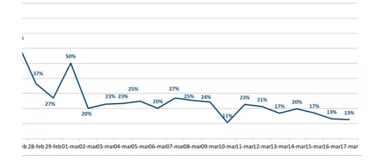 A graf, ki je v tem trenutku najbolj pomemben in vliva največ upanja, prikazuje odstotek povečanja okužb. Ta izraža, koliko so strogi ukrepi vplivali na širjenje virusa. V zadnjih desetih dnevih, torej po tem, ko je italijanska vlada sprejela najbolj rigorozne ukrepe po vsej državi, vidimo majhen, a konstanten upad povečanja okužb. Te so tako 8. marca rasle še za 27 %, sedaj je večanje okužb pri približno 13 %. Italijanski strokovnjaki se strinjajo, da gre za počasen upad, ki pa daje upanje.
