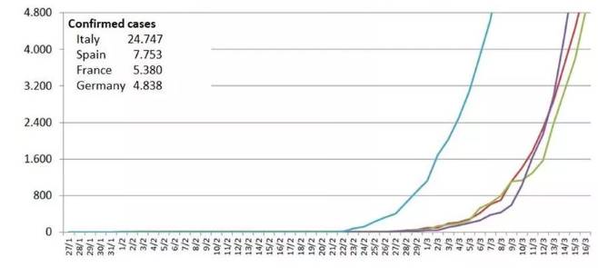 Zanimivo je primerjati število obolelih v različnih državah EU, ki so najbolj na udaru. Raziskovalna organizacija Gimbe je na svojih grafih pokazala, da so Francija, Nemčija in Španija 7 - 10 dni za Italijo.