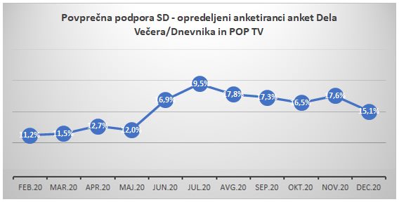 Povprečna podpora javnomnenjskih anket v zadnjih treh mesecih: 15,8 % opredeljenih sodelujočih