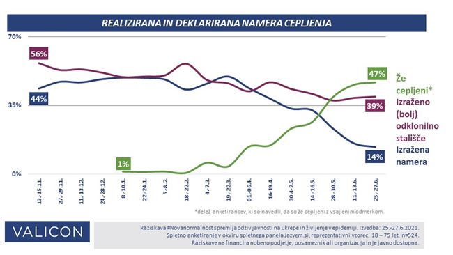 Predsednik vlade govori o potrebi po 70 % precepljenosti v izogib jesenskemu zaprtju, javnomnenjska raziskava Nova normalnost, ki jo tekom pandemije izvaja agencija Valicon, pa kaže, da je realno pričakovati le nekaj več kot 60 % precepljenost: