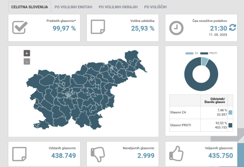 Ob 21. uri so prešteli že več kot 98 odstotkih glasovnic, po zadnjih podatkih je proti zakonu o dodatku k pokojnini za izjemne dosežke na področju umetnosti glasovalo 394.766 volivk in volivcev oziroma 92,52 odstotka tistih, ki so se referenduma udeležili.