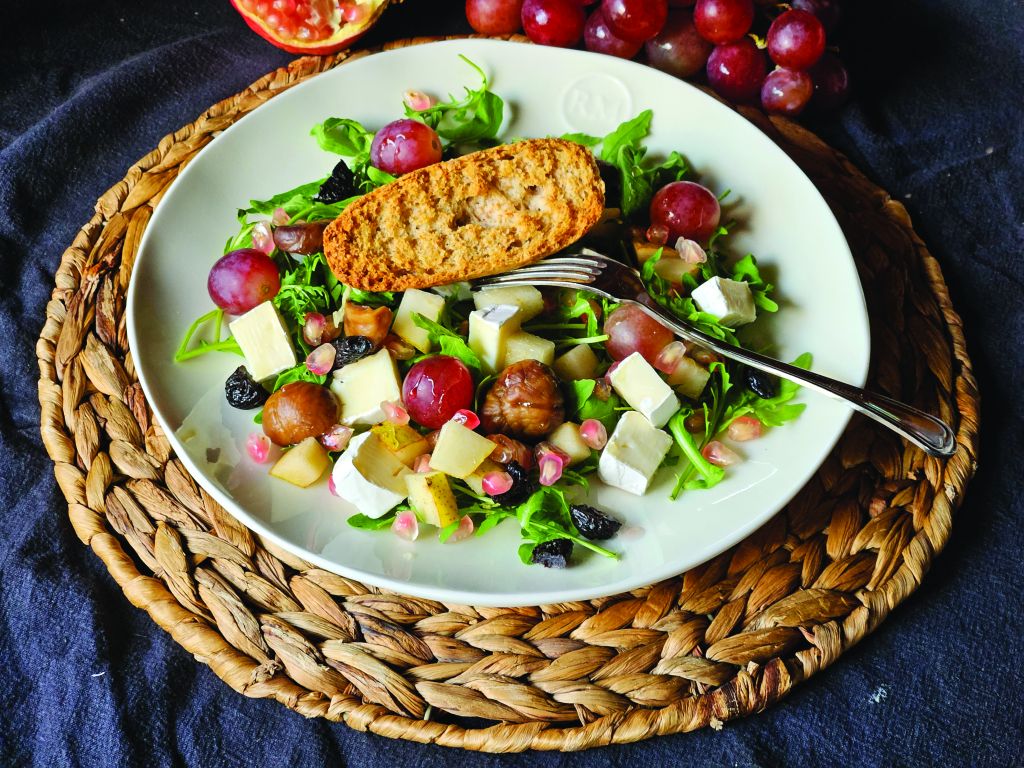 Rukolo očistimo in operemo ter jo na papirnati brisački osušimo. Postavimo jo na plitek krožnik. Rahlo jo posujemo s soljo. Camembert narežemo na manjše koščke in ga razporedimo po rukoli. Dodamo oprane jagode grozdja. Suhe slive narežemo na manjše koščke in jih posujemo po rukoli. Dodamo cele plodove kuhanega in olupljenega kostanja. Iz granatnega jabolka izluščimo za dve jušni žlici zrnc ter jih posujemo po sestavinah na krožniku. Hruško narežemo na majhne kocke in jo dodamo na solato. Sestavine prelijemo z žličko oljčnega olja, žličko belega sladkega kisa ter z žličko medu. Postrežemo skupaj s hrustljavo opečenimi kruhki.