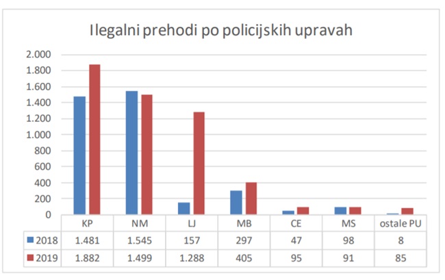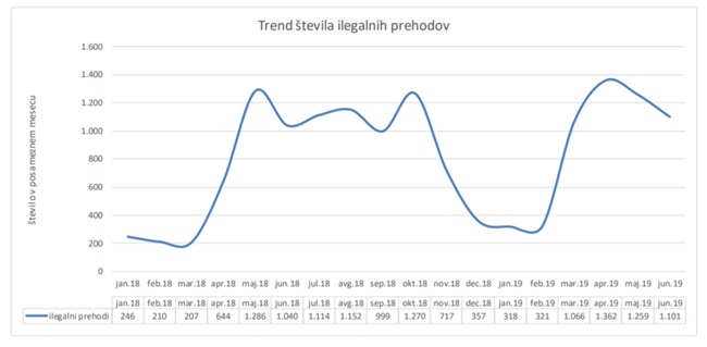 V obdobju od 1. januarja do 30. junija 2019 so policisti na območju Republike Slovenije obravnavali 5.345 (3.633) ilegalnih prehodov državne meje. Število se je glede na enako obdobje preteklega leta povečalo za 47,1 odstotkov.
