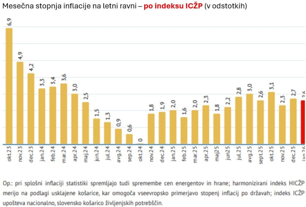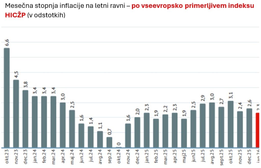 Če inflacijo pogledamo skozi nacionalni indeks cen življenjskih potrebščin, ki temelji na slovenski potrošniški košarici, je bila rast cen januarja še nekoliko višja, 2,6-odstotna.