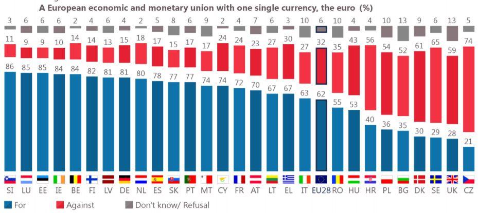 Obenem smo Slovenci po zadnji raziskavi Eurobarometra med vsemi državami članicami EU najbolj naklonjeni evropski ekonomski in monetarni uniji s skupno evrsko valuto:
