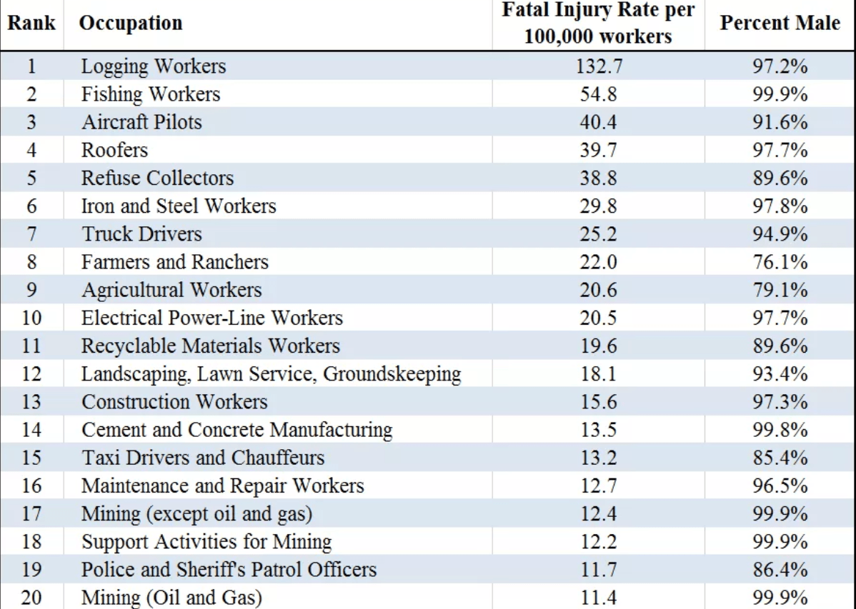 Iz spodnje tabele, ki jo je vključil v svoj tvit, je jasno razvidno, koliko odstotkov moških dela v najbolj nevarnih poklicih in koliko jih umre na leto. Med njimi so gozdarji, ribiči, piloti, delavci z jeklom in kovino, kmetje in rančerji, delavci na višini, rudarji in itd.