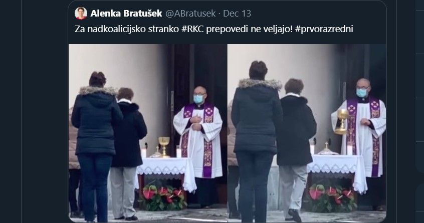 Zraven je pripisala: "Za nadkoalicijsko stranko #RKC prepovedi ne veljajo! #Prvorazredni." Kot nekdanja premierka bi morala vedeti, kakšni so ukrepi. Če si je ogledala posnetek, iz katerega je izrezala slike za politikantsko nabiranje točk z napadanjem Katoliške Cerkve, bi tudi morala opaziti, da ni bil kršen noben ukrep.