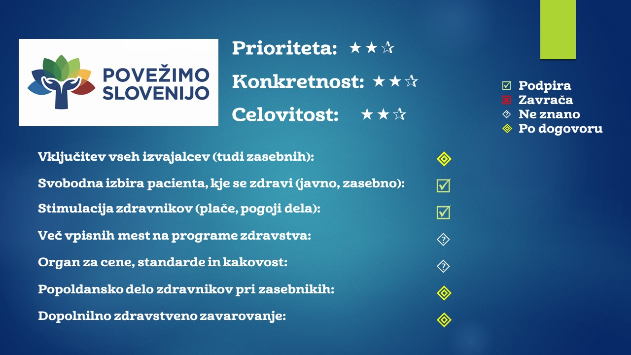 V Povežimo Slovenijo menijo, da bi lahko Slovenija postala vozlišče zdravstvene oskrbe za vso Evropo. Pot do tja pa vidijo v krepitvi primarnega zdravstva, telemedicini in povezljivosti različnih informacijskih in drugih sistemov, digitalizaciji in točnejšemu plačevanju storitev.
