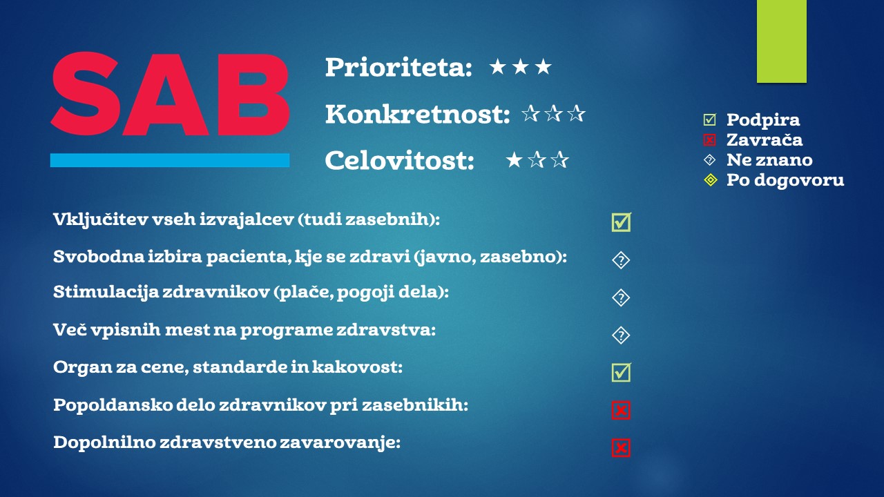 Več o konkretnejših stališčih stranke SAB najdete v našem Vodniku po volilni izbiri.