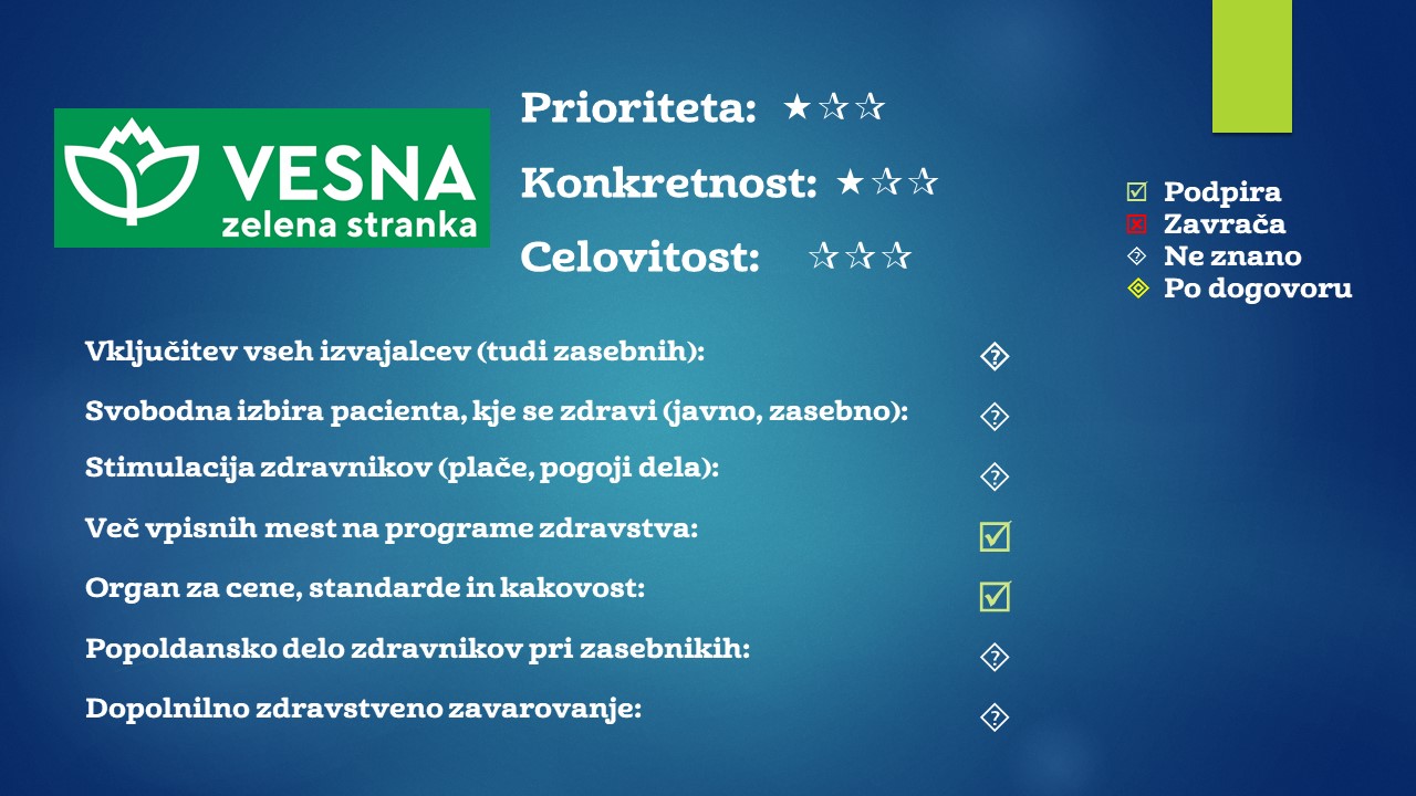 Vesna, zelena stranka na prvo mesto postavlja pravico do splava, kontracepcije in dostop do storitev za ženske. Menijo, da je potrebna zagotovitev finančnih sredstev (od kod in kako ne izvemo) in kadra, kar bi dosegli s štipendijami za študente medicine in povečanjem števila specializacij. Zagovarjajo transparentno nabavo, ukinitev zdravstvenega zavarovanja, optimizacijo mreže bolnišnic, onemogočanje preskakovanja vrst in posodobitev informacijskega sistema – podrobnejših informacij, kako bodo to dosegli pa v programu ne najdemo.